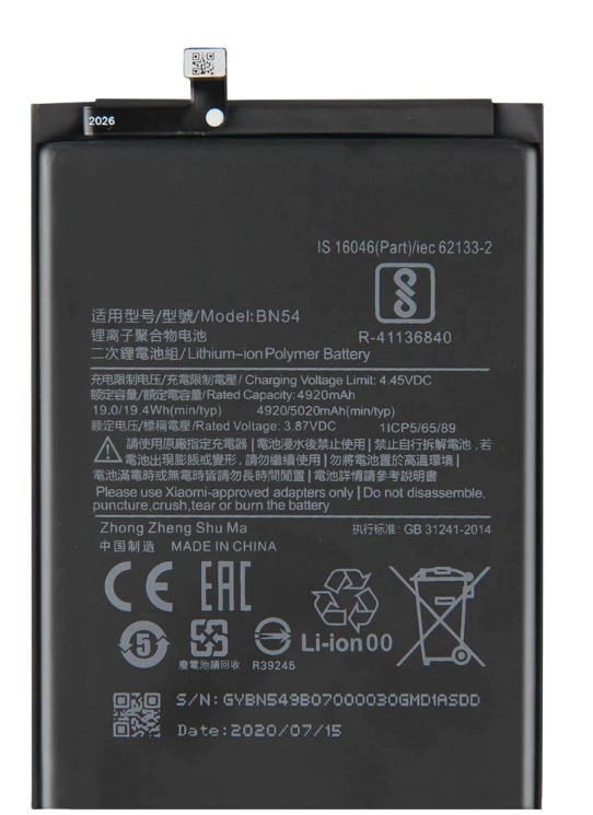 BATERIA XIAOMI REDMI 9/REDMI NOTE 9/BN54 3800MAH