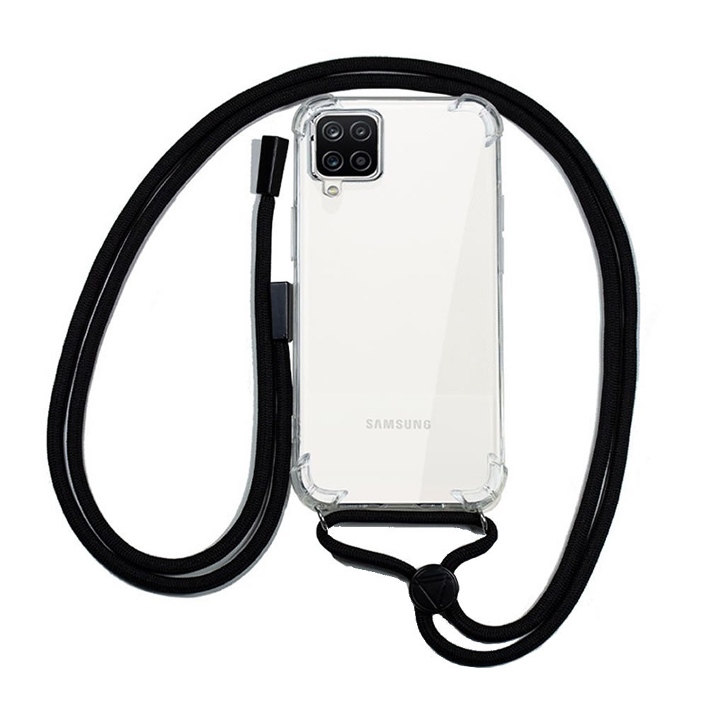 CAPA SILICONE DURA ANTI-CHOQUE SAMSUNG GALAXY A12 TRANSPARENTE COM CORDA PRETA